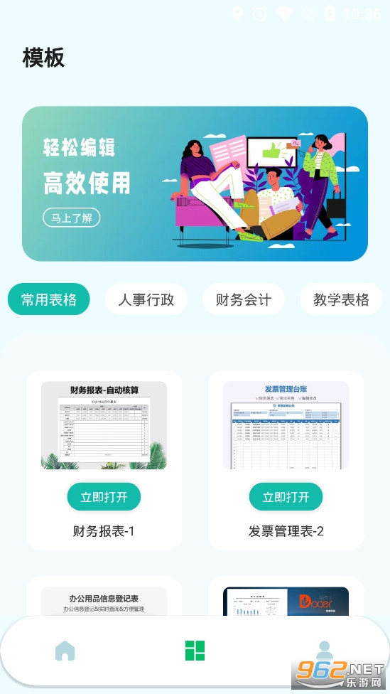 2.《表格模板》常用表格、人事行政、财务会计、教学表格,轻松一键使用。