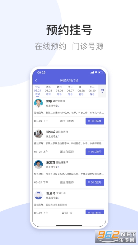 【预约挂号】可通过患者APP找到门诊医生的线下出诊号源并进行预约。