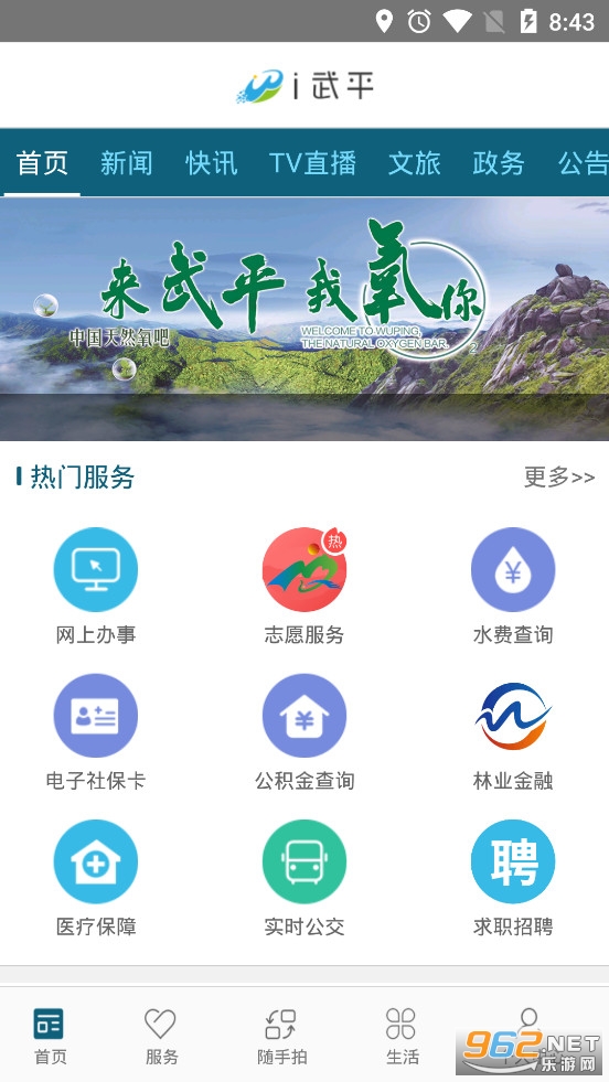 《i武平app》是福建智慧海西信息技术有限公司推出的一款武平综合服务平台,i武平app有着首页、服务、随手拍、生活和个人中心多个栏目,朋友们可以在软件中阅读和观看各种新闻资讯,可以查询社保公积金,可以找车位查公交查违章,还可以预约挂号等等。