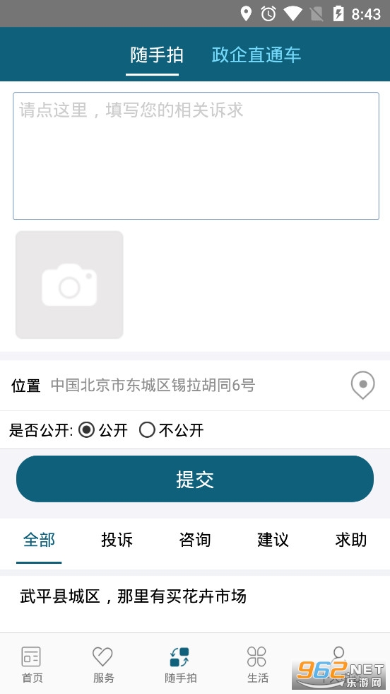 “随手拍”服务,让武平市民在向政府提交相关城市管理相关诉求时,精准定位问题地址,方便相关单位及时、准确的触及诉求现场。另为提升本地投资环境,特在“随手拍”的基础上建设政企直通车栏目。