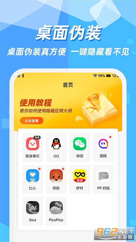 隐藏应用帮助你隐藏应用程序。通过隐藏应用程序来保护您的隐私。不用担心其他人借用手机访问您的私人应用程序,或打开您的社交应用程序。在不删除手机界面上已被隐藏到隐藏应用中的应用时,可以通过隐藏应用中或手机界面两种方式启动该应用程序。