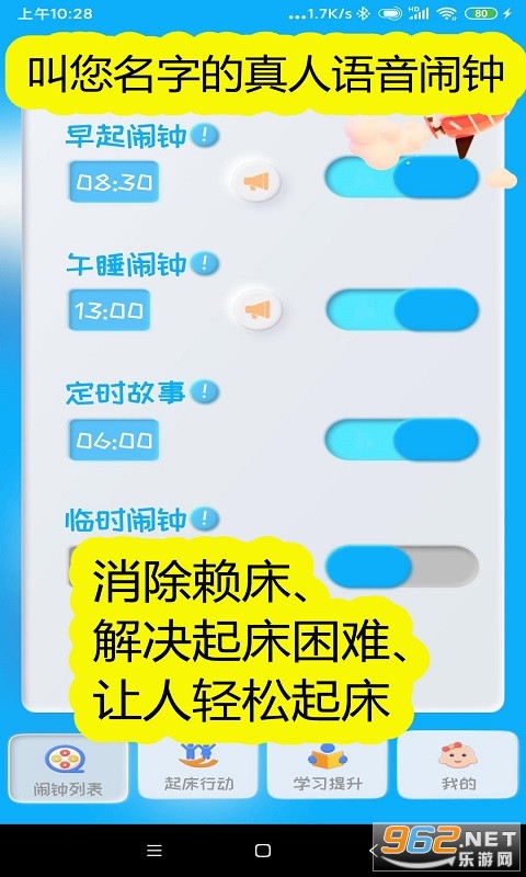 《同学快起床app》是一款非常给力好用的真人语音闹钟软件,不但操作起来非常简单那,功能强大,它集成了专业的催眠冥想音频,可帮助学生用户打开潜意识的学习开关,感兴趣的朋友还在等什么?欢迎来962下载体验试试吧!