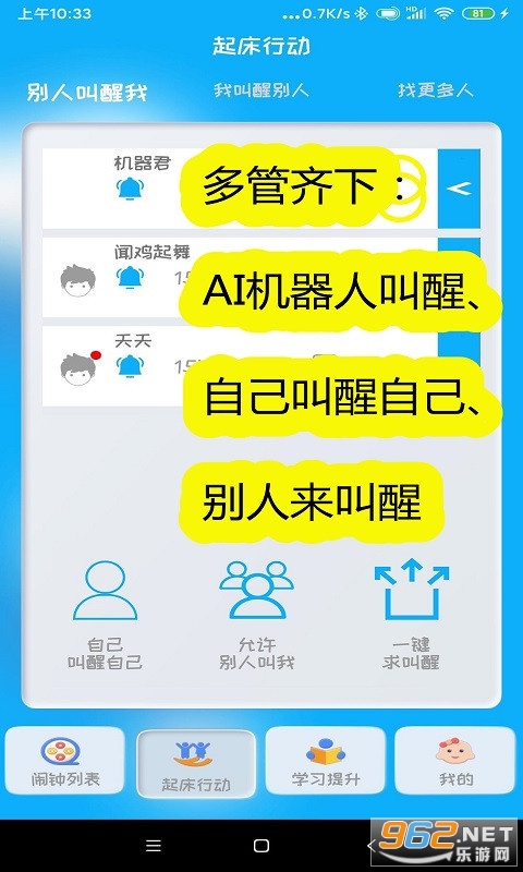 它的原理就是让您的死党们、好同学们、好基友们、好闺蜜们来叫醒您。