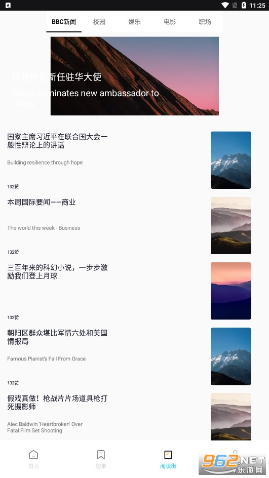 1.在英语外刊阅读app中,还有为用户精选的全球热文资讯,包括但不限于bbc新闻、校园、娱乐、电影、或者是职场等等的资讯内容都可以提供给用户。