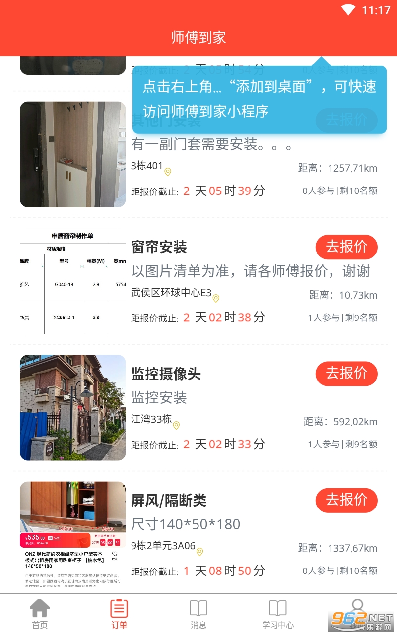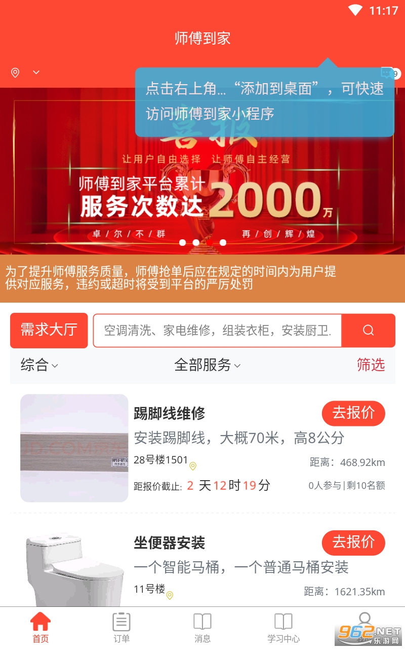 师傅到家是一家互联网科技生活服务商城,提供全国同城生活到家服务,涵盖上门安装/上门维修/上门清洗/上门保洁/搬家拉货等综合性同城到家服务。用户一健下单,多位师傅竞标报价,用户轻松挑选师傅中标,满足了全国用户的业务需求。