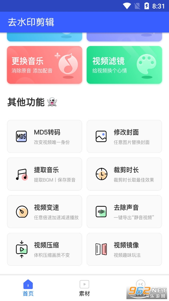 无水印剪辑是一款免费去水印的工具类应用,可以自定义擦除水印、裁剪尺寸、视频滤镜、MD5转码、修改封面、提取背景音乐、时长裁剪、视频变速、去除声音、视频压缩、视频镜像操作简单,界面简洁;