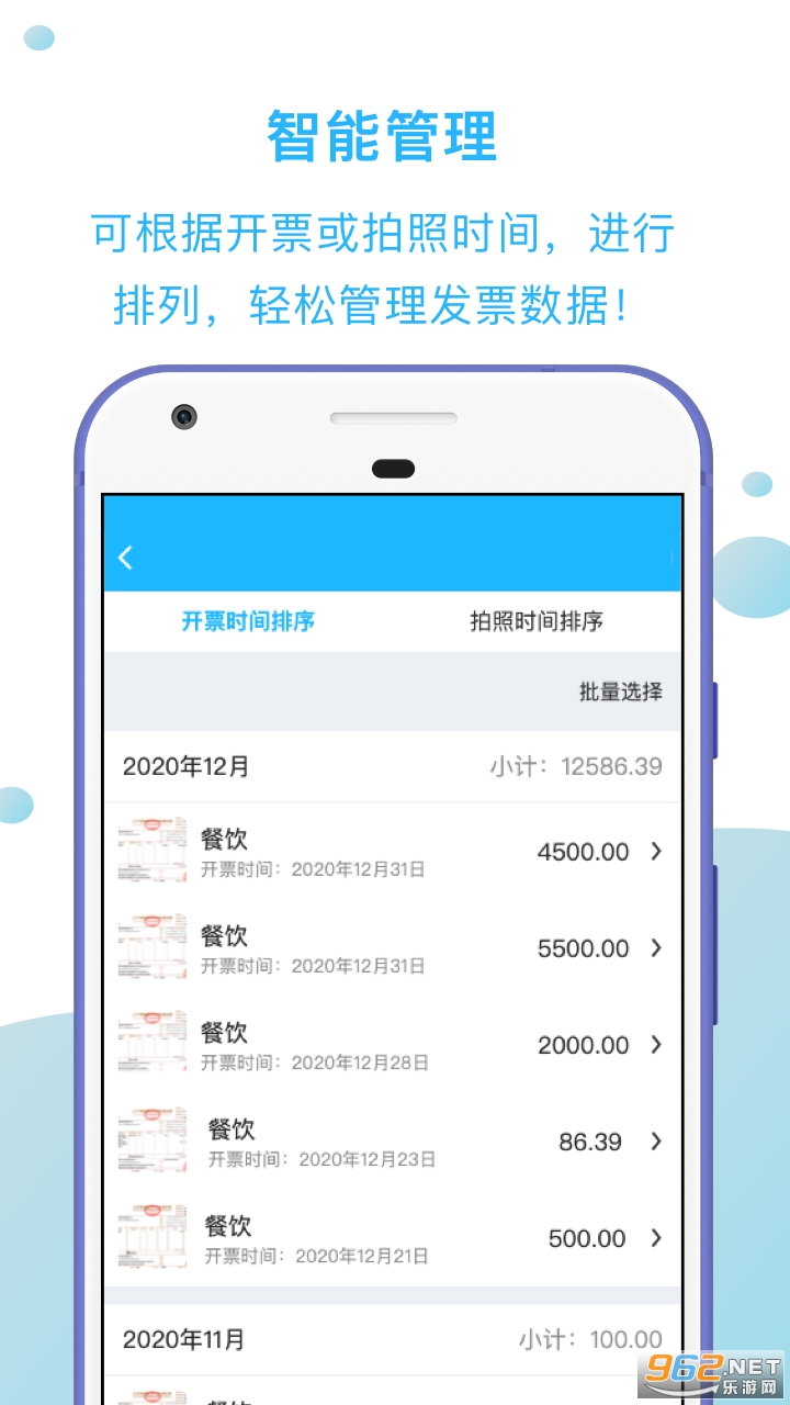 【发票管理】可根据开票或拍照时间,进行自动排列,轻松管理发票数据