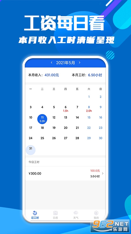 《每日记工资》是一款由上海倍效网络科技有限公司开发的为临时工作进行记录的软件,通过这款软件你可以记录工时来进行工资的结算,软件的操作简单容易上手,还有着天气日历等便捷的功能,快来点击下载吧!