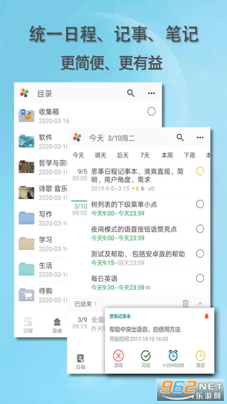 用于工作、生活、学习日程、计划、笔记、灵感记录等,更简便,更有益。