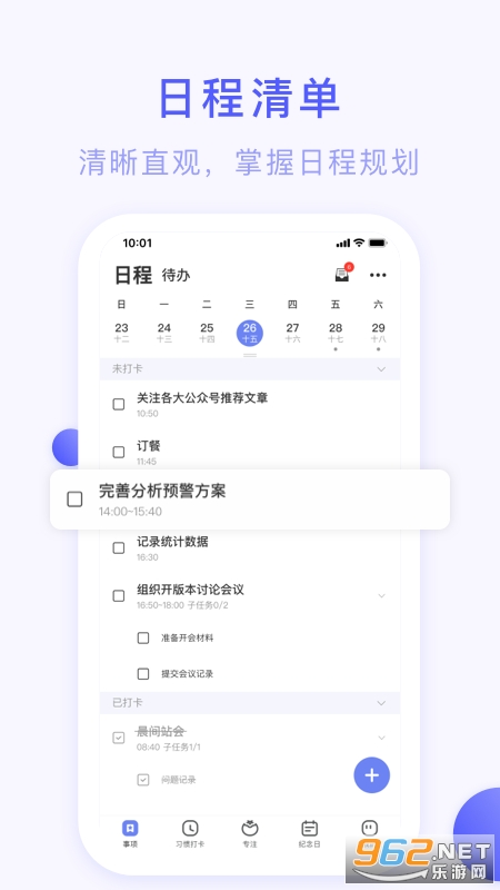 一款好用的时间管理软件,通过日历的模式展示每天需要完成的事情列表,同时还有着各种习惯打卡,记录下关键的纪念日,软件的操作简单容易上手,推荐给有需要的用户。