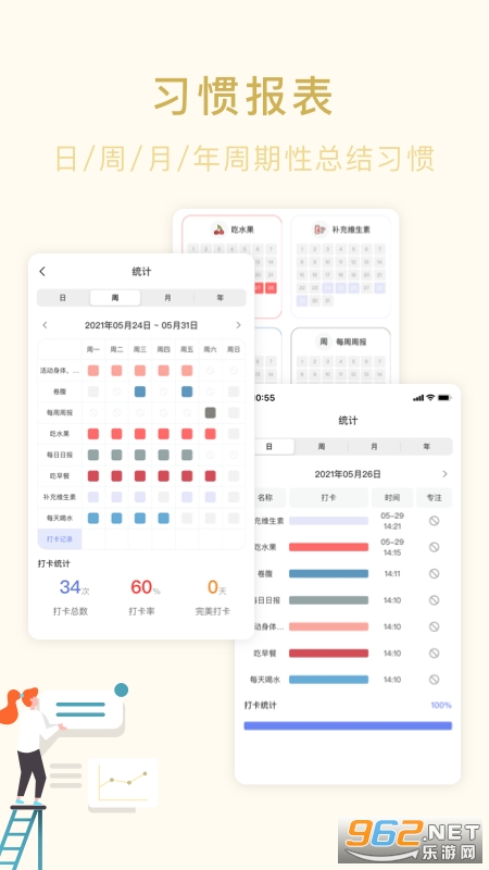 习惯打卡:记录你要养成的习惯,生成详细的打卡记录,追踪你每日的时间记录例如:目标打卡,喝水打卡,早起起床打卡,早睡打卡,签到打卡,学习打卡,上课打卡,网红打卡,21天日常习惯打卡计划,记工账本等。