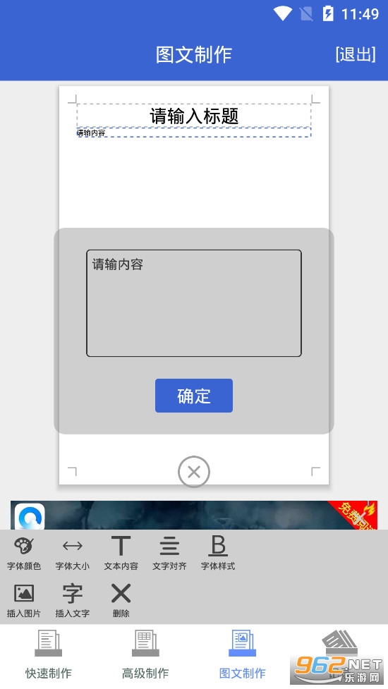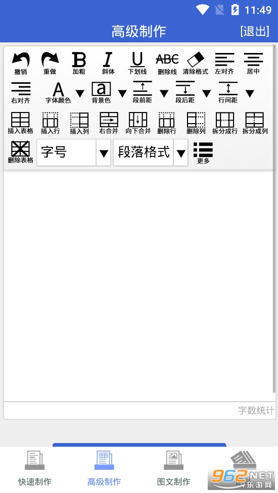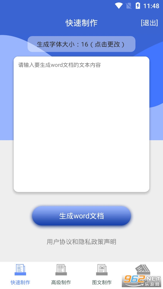 《word文档制作生成app》是一款为朋友们打造的word在线编辑软件,进入word文档制作生成app之后可以看到快速制作、高级制作、图文制作和记录四个模块,可以选择自己需要的功能去进行使用,可以快速的进行排版、选择字体大小颜色等等。