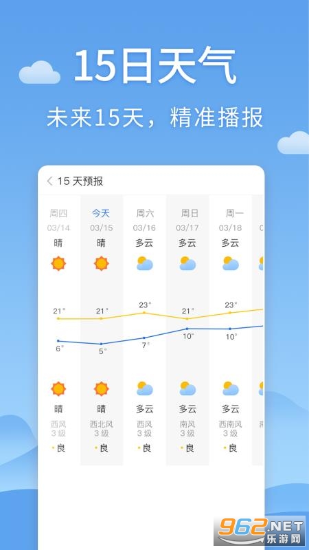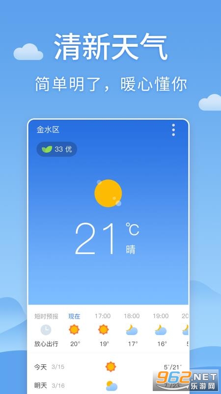 《清新天气预报安卓版》是一款非常给力好用的天气预报软件,这里为用户提供最好的天气预报功能,操作非常简单,安装也方便,这里能够为用户提供最新的天气须知,操作也方便,感兴趣的朋友还在等什么?欢迎来962下载吧!
