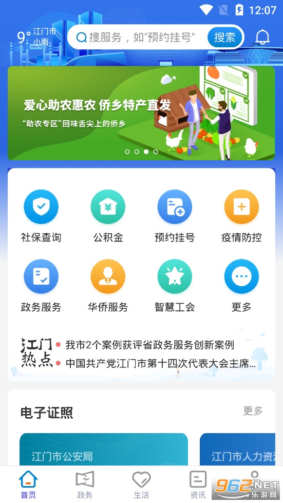 《江门易办事app》是江门市政务服务数据管理局推出的一款江门市综合服务平台,江门市的朋友们可以在江门易办事app中体验便利的服务,平台有着首页、政务、生活、资讯和我的多个栏目,可以查询社保、公积金,可以在线缴纳交通罚款、购买车票等等。