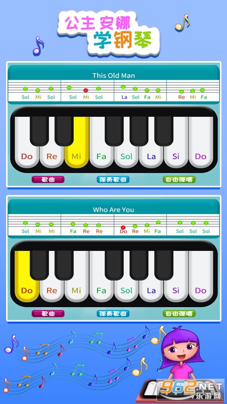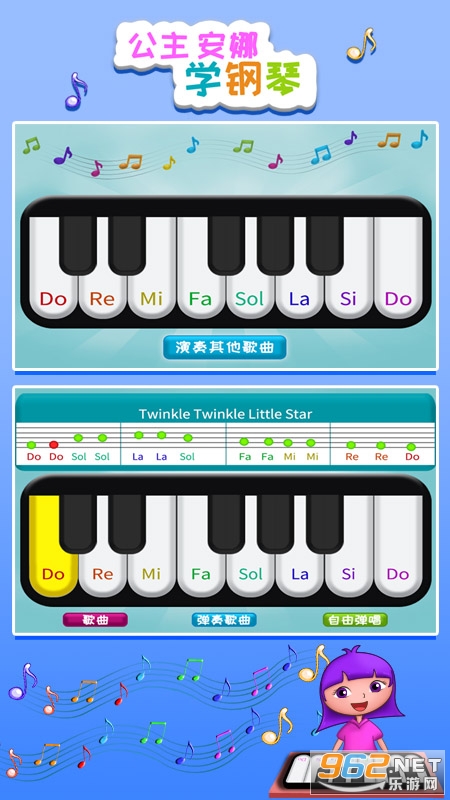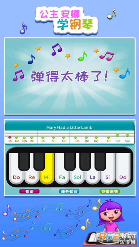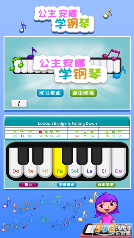 公主安娜学钢琴是一款为儿童而设计的钢琴练习软件、通过简单的钢琴练习,让没有钢琴基础的小朋友轻松弹奏出动听的钢琴曲。