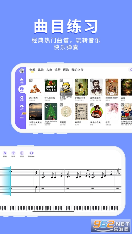 钢琴智能陪练是一款专为学习钢琴的朋友们所打造的应用软件,软件中包含了当前通用的各类教材和各式曲风的钢琴谱,曲谱包含由简单到高级的三种不同难度,哪怕是初学者也能快速上手演奏。