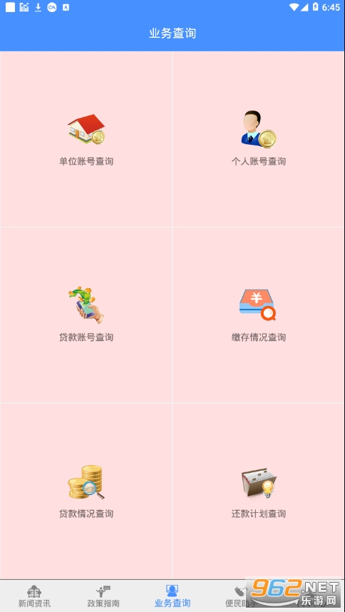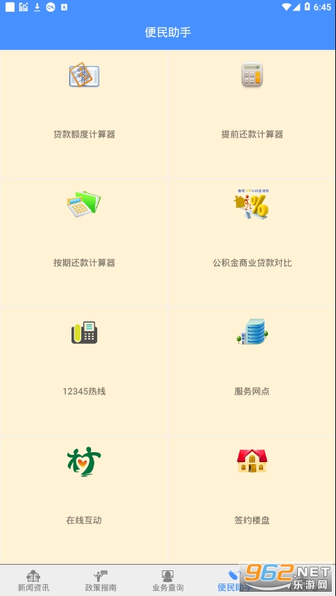 3、资讯动态:包括新闻动态、政策法规、办事指南、网点信息、存贷款利率、贷款计算器,无需登录可查阅。涉及贷款、提取等服务的板块,需要用户用公积金账号、密码登录。