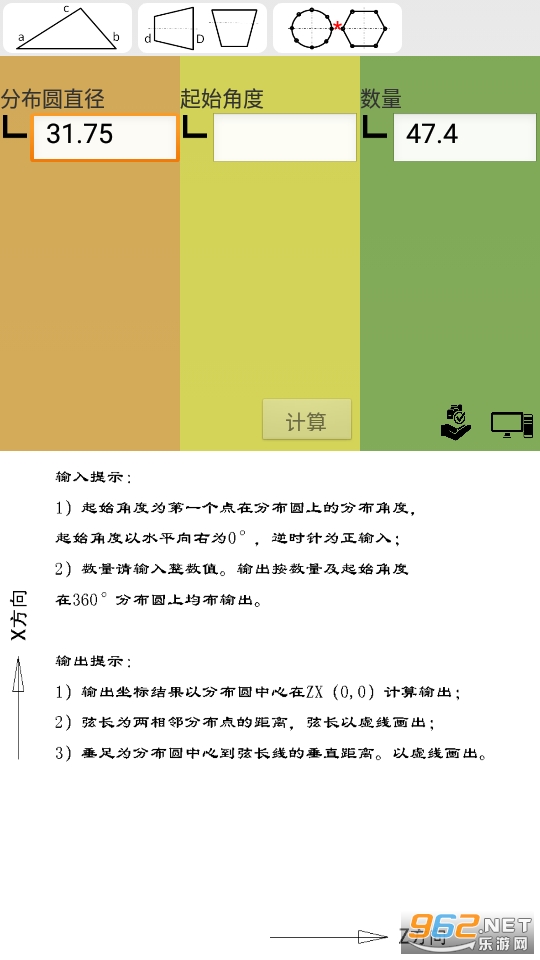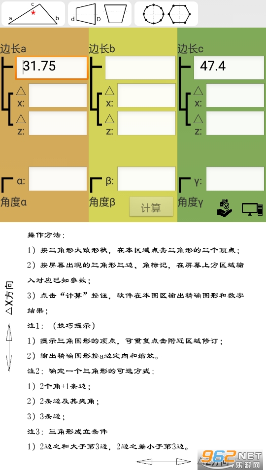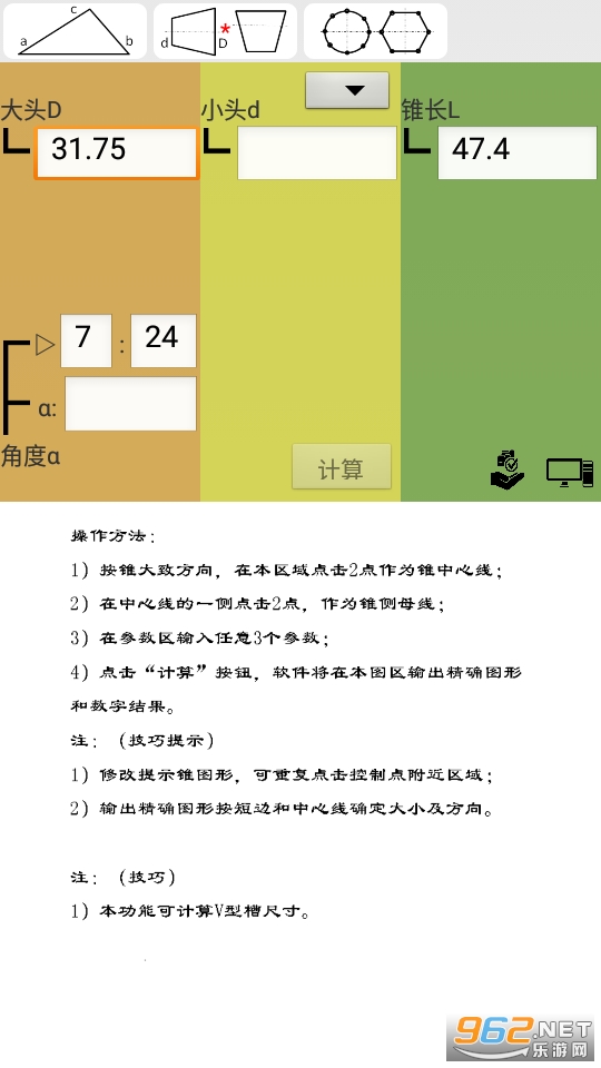 图形计算安卓版用于三角形、锥度的计算与查询,输入有自绘图形提示,输出具有图形与文字双输出功能。结果图文并茂,简单直观。软件是机械设计、加工从业者和学生的得力工具。
