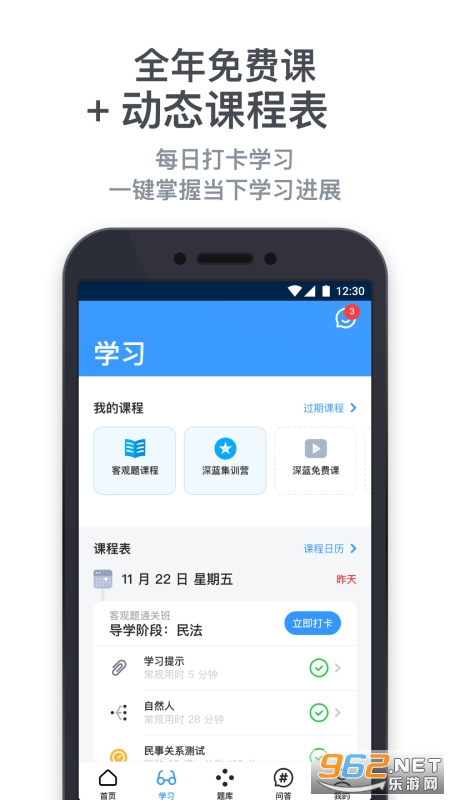 深蓝法考app是一款专供需要法律考试的用户打造的手机学习软件,软件内不仅拥有丰富的习题库,还有专业老师在线进行授课。不管你有什么问题都能直接得到解答,全程陪伴式服务让你更加轻松的通过考试!