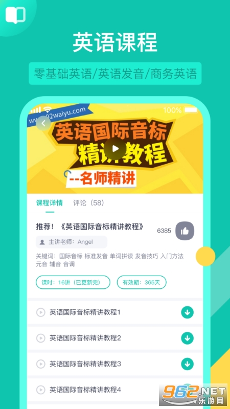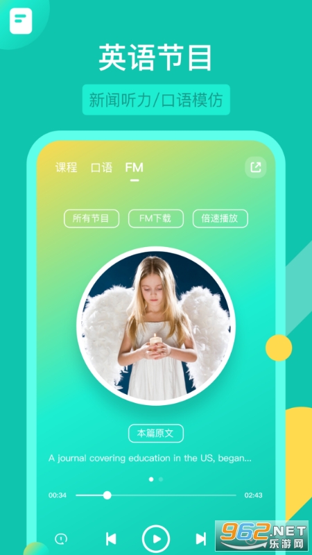 趣味配音学英语、练口语!海量课程!以趣味“英文电影配音”为核心,快速提高学员的英语口语和听力能力,并提供英日韩法德俄西阿葡意泰越波斯语、缅甸语、粤语、闽南话、土耳其语、乌尔都语、波兰语、外国人学中文等超全语种课程,从零基础到高阶段课程均有涵盖,海量生活相关的实用主题,如:做生意、商务、旅游、打电话、购物、订机票、住酒店等,另有实用口语模仿、海外新闻听力、单词速记、双语阅读等趣味功能,快速学英语,一个APP就够了!
