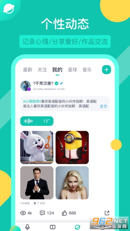 主要功能:1、英文电影配音2、英语教材配音 3、动画片配音 4、在线合作配音5、在线举办配音大赛 6、英语零基础课程5、商务英语课程6、生活口语句句练7、英语电台节目8、英语兴趣群聊9、心情动态发布(图文+语音)