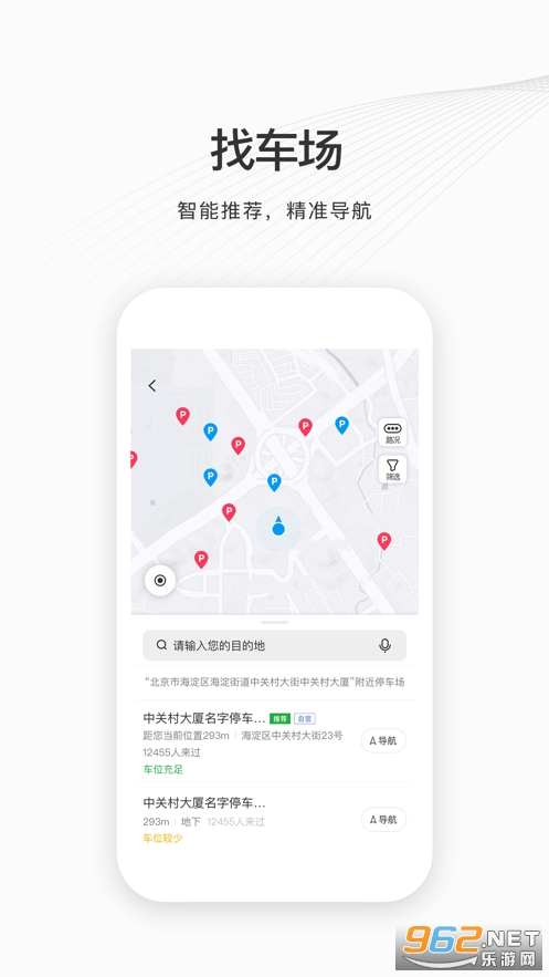 1.打开你的手机定位,就可以帮助你推荐就近的停车场搜寻是否有空的位置。