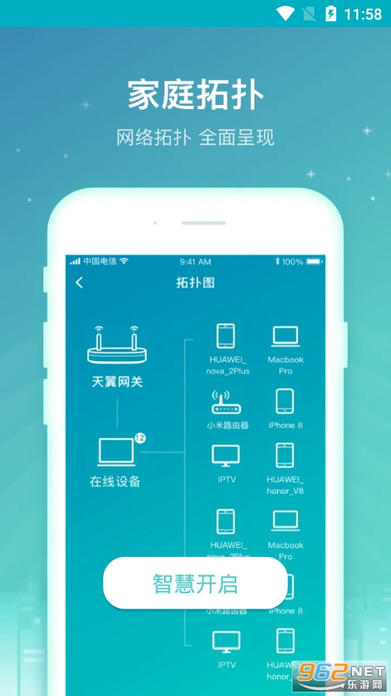 《天翼网关app》是中国电信股份有限公司上海研究院推出的一款网关管理软件,适合家里安装了电信天翼产品的用户,可以用来管理这些设备,设置网关等,可以查看路由器,了解家庭拓扑图,对wifi进行设置,比如定时开启和关闭、修改名称等等。