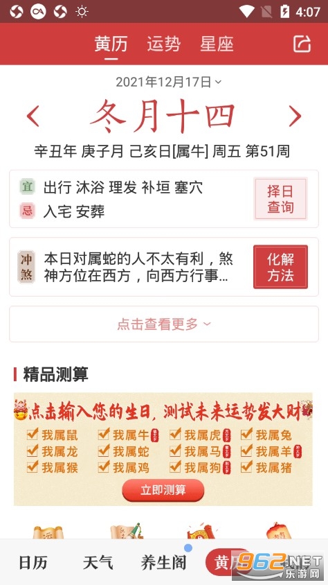 2、每日宜忌、特殊方位、生肖合冲、干支五行、时辰吉凶、黄道黑道、建除、吉神凶煞、人神忌、彭祖忌。