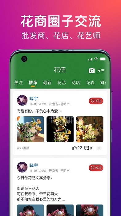 花伍鲜花交易平台官方版是一款鲜花批发的软件,可以在这里找到更多美丽的鲜花,现场采摘,可以打分量的去批发,找货源的好地方,还有各种插花的食谱,还有不同的经营花店的详细教程,让你能更快的去选择你的鲜花品种。