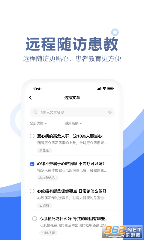 3、远程教育,健康知识,用户可以通过软件中发布的各种优质健康资讯文章来为患者服务,将各种优质文章直接发送,提高患者健康意识。
