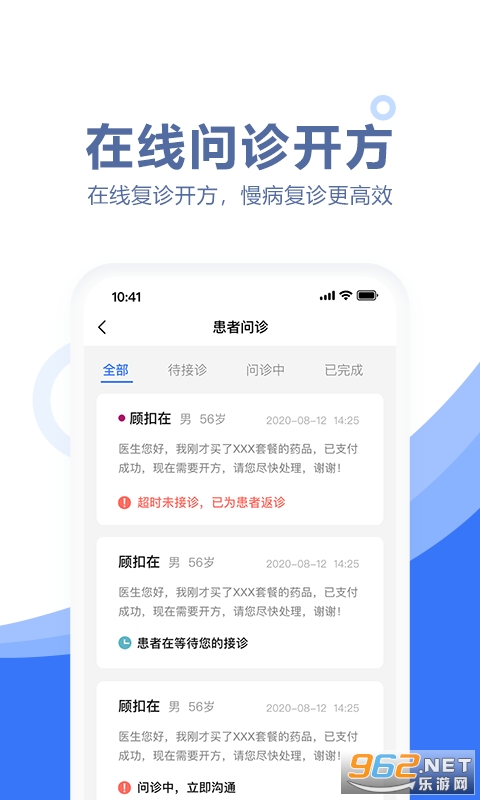 2、问诊开方,高效医疗,软件中有着非常丰富的各种在线问诊功能,能够帮助用户更好的处理各种患者的问题,在线接诊,提供医疗方案;