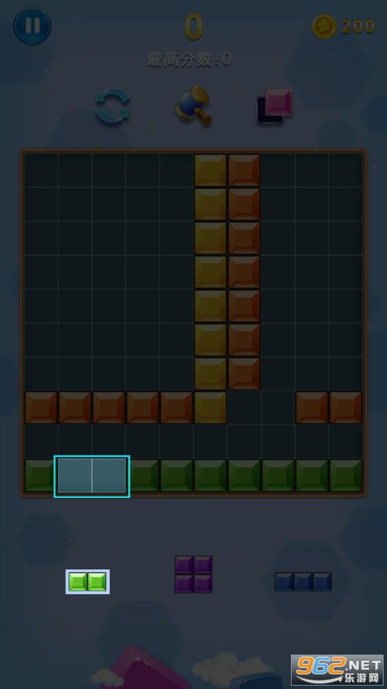 拖动模式:将屏幕下方的三个备选方块拖入2048宫格中,一行或一列铺满即可消除,直至备选方块无法放置,则消除游戏结束