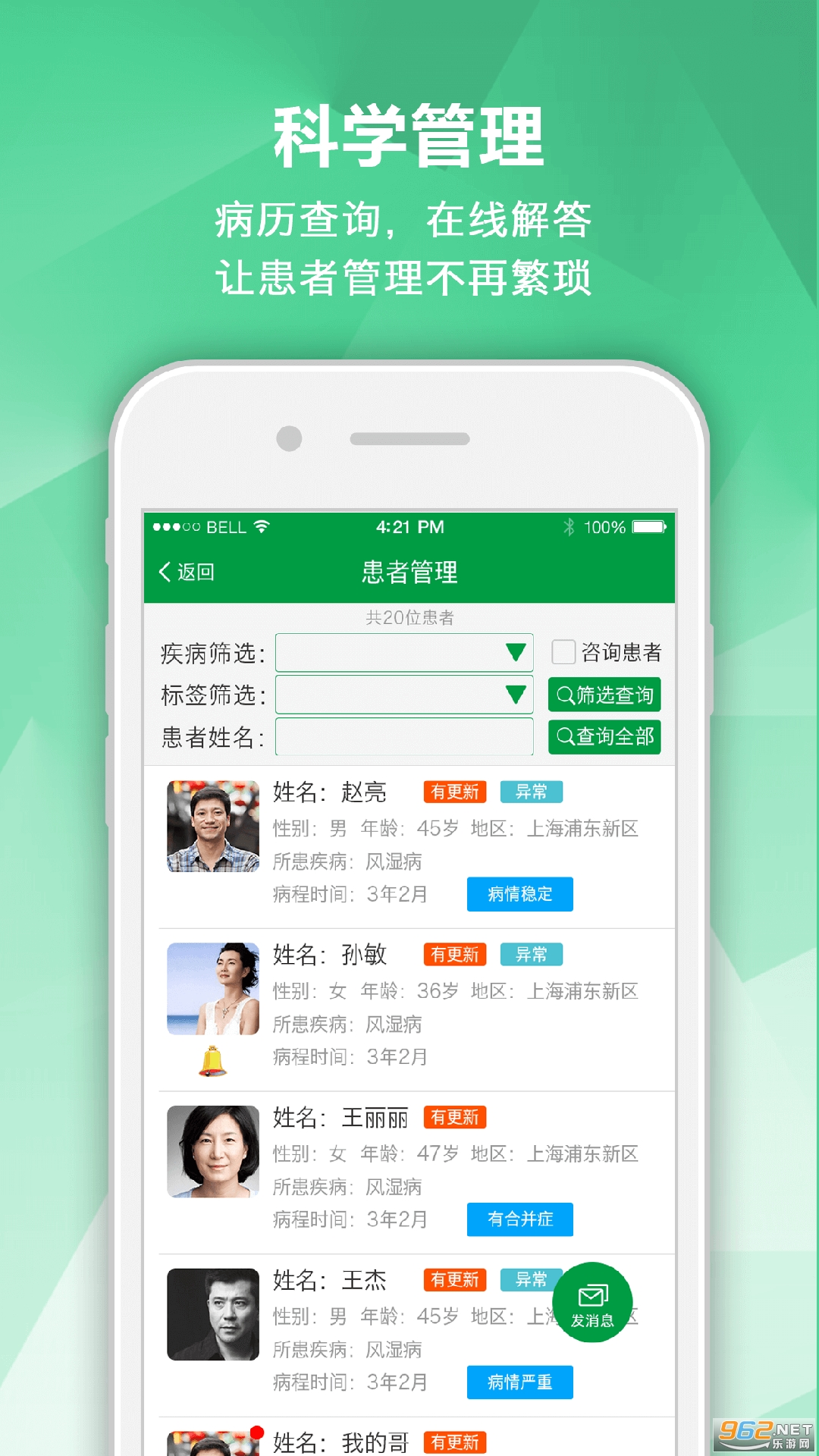 患者管理:筛选患者后编辑患者信息,在线发送消息;
