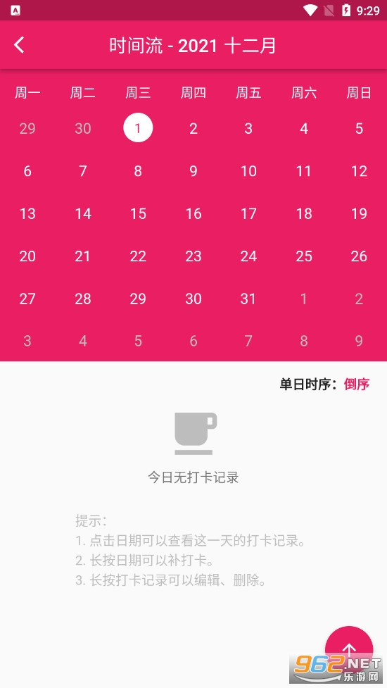 时间流里提供日历功能和记录列表。可以点击日历跳转到某一个的记录,查看每一天做的事情。时间流里可以补打卡记录、编辑打卡记录、删除打卡记录。时间流分为总任务和单任务,区分查看。