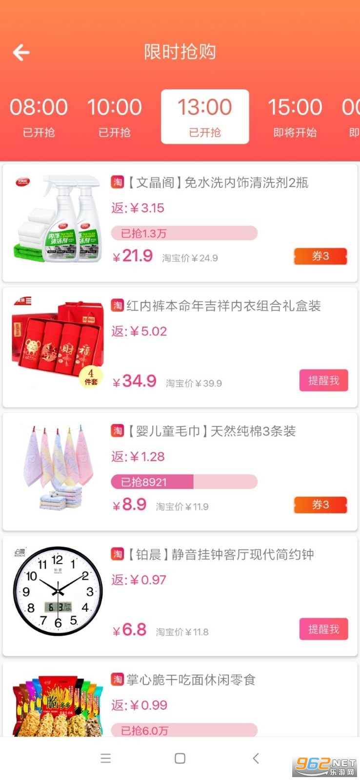 各种抢购活动,整点限时开抢,这个点错过了没关系,下一个点的优惠活动马上来袭;