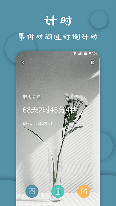 它可以帮你记录生活中的点点滴滴,例如:结婚纪念日倒计时,春节还剩多少天倒计时,高考还剩多少天倒计时,离出差还有多少天,宝宝出生已经多少天,能够记录过去的美好时光,以及未来的期待。