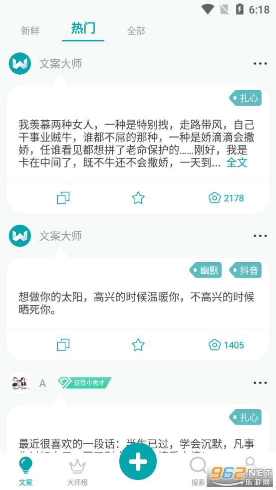 一款提供火爆文案大全的应用,文案大师软件满足用户文案需求,覆盖内容广泛,用户可以随时搜索到最新流行的配文,文案大师上自己也能上传好句子。