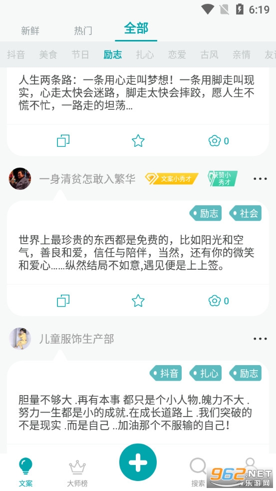 《文案大师app》是一款为朋友们打造的看文案和写文案的软件,文案大师app中有着美食、节日、励志、爱情、古风、自拍、聚会等各种哦不同类型的文案,可以去选择自己喜欢的文案发在自己的朋友圈,不用冥思苦想的想各种文案了。