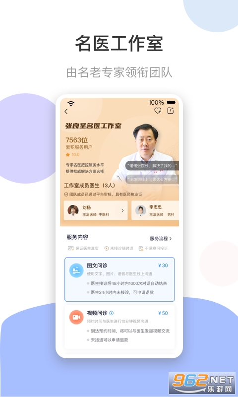 在线问诊开方:名医领衔,与团队成员为用户进行问诊诊断和复诊开方。