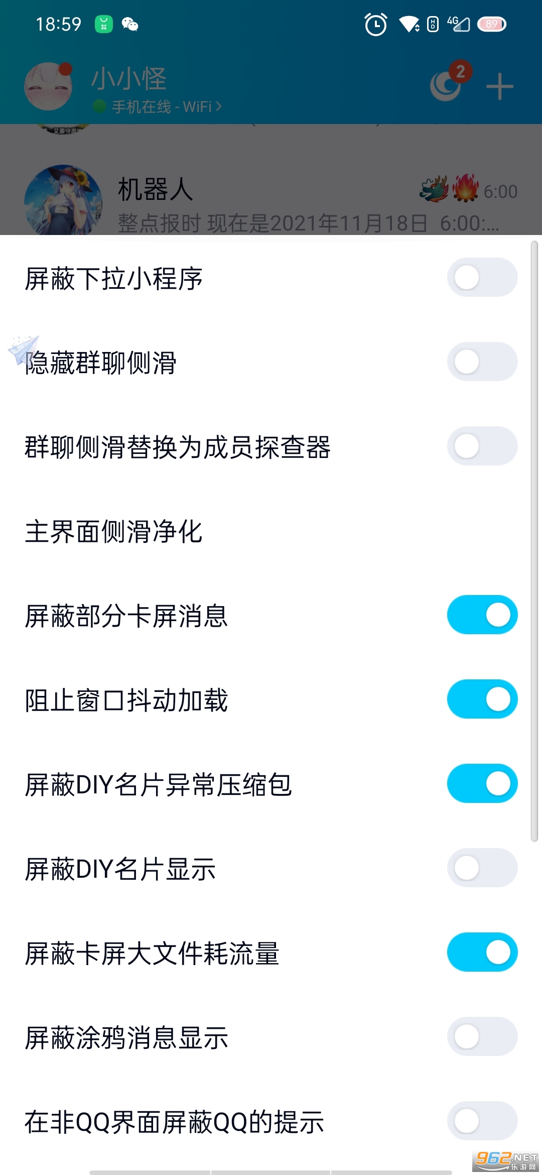 11.屏蔽窗口抖动,屏蔽部分卡屏消息,屏蔽DIY名片,屏蔽DIY名片ZIP炸弹,屏蔽消耗流量的卡片,屏蔽涂鸦的显示,屏蔽花里胡哨字体,气泡