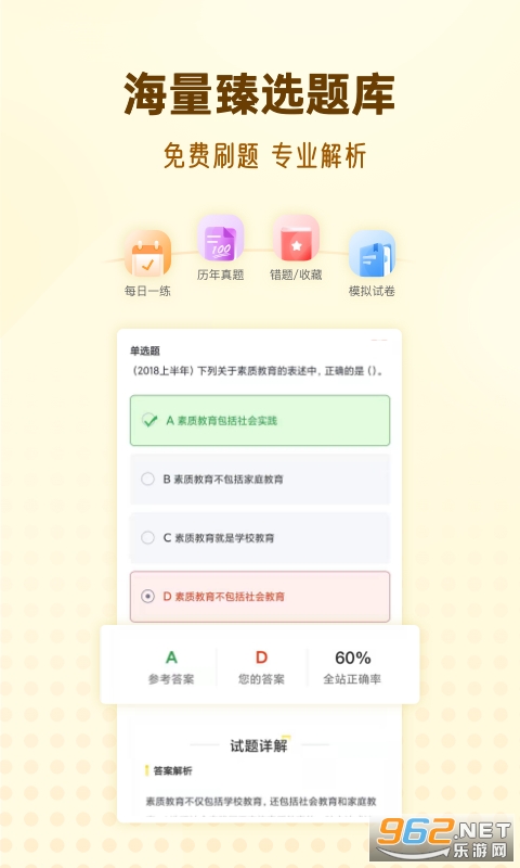 章节练习深度掌握知识点,每日一练随机精选强加巩固,历年真题归纳往年高频考点,模拟试卷及时查漏补缺,紧贴考试大纲,边学边练好掌握;