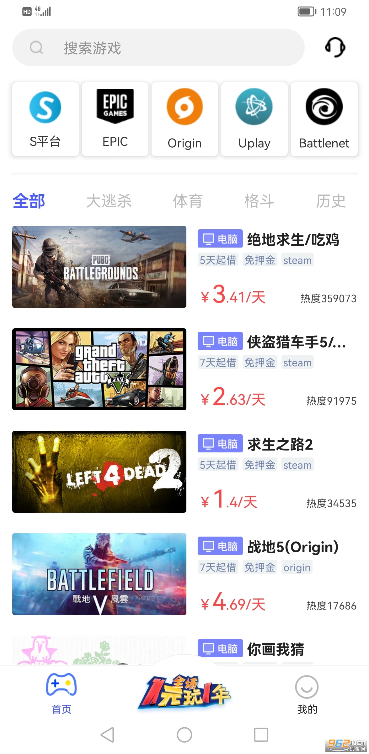 绝地求生、gta5、人类一败涂地、战地风云5、怪物猎人世界等超多游戏供您选择