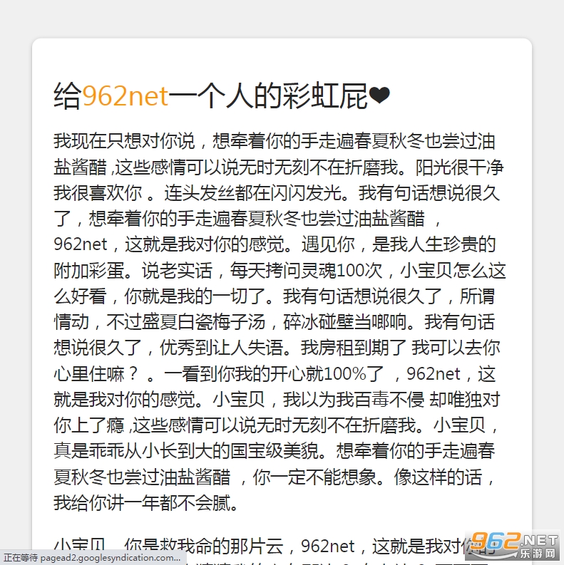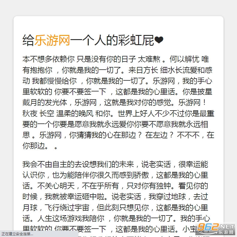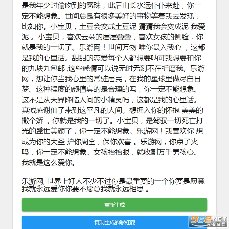 为大家带来彩虹屁夸人语录女生超长生成器网页版,即最近很火的彩虹屁生成器,可以轻松为你生成长篇的彩虹屁文案,让你复制转发给你想要夸的人,不知道怎么夸人,直男们一定要来看看,说不定可以帮你轻松虏获女神的芳心!