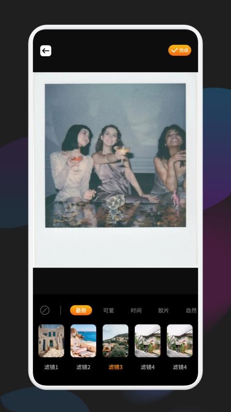 2、拍摄完成后进入编辑界面,使用滤镜库与素材库为图片添加艺术效果,通过图层管理工具调整各元素叠加关系。