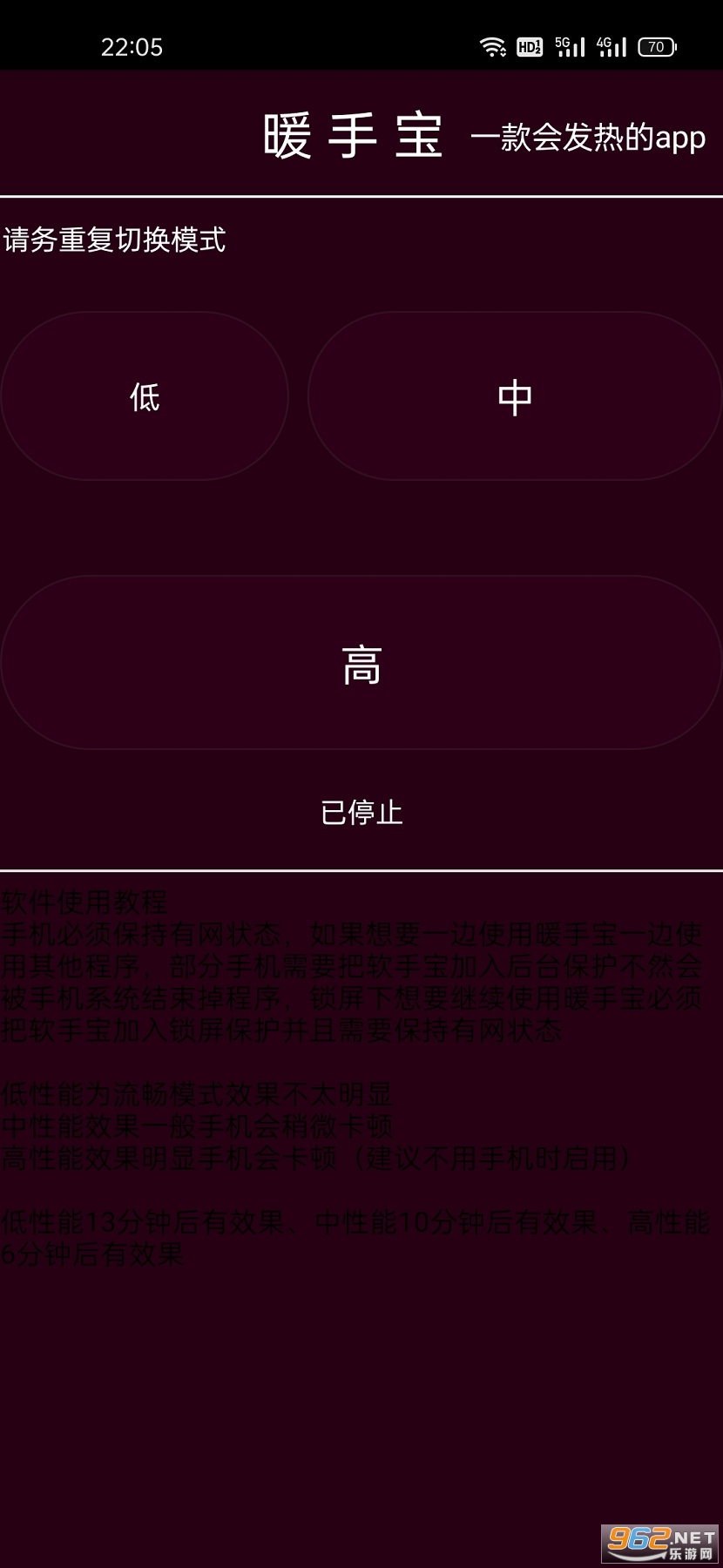 总体来说是一款非常不错的搞笑类的工具,通过cpu的发热来带动手机发热然后当做冬天里的暖手宝,十分的有趣哦,喜欢的亲们可以下载试试。