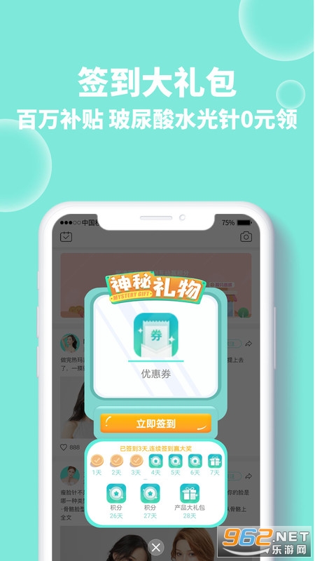 玩赚积分,0元变美!打卡签到,写日记,社区互动,均可获得大量积分。积分可用于兑换项目、抽取礼品,轻奢美妆、爆款项目、热门商品0元起兑。