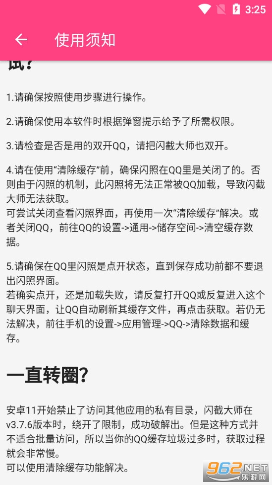 《闪截大师app》是一款为朋友们打造的可以获取QQ闪照的软件,闪截大师操作起来非常的简单,朋友们打开qq点开闪照,然后在返回到闪截大师app,点击获取闪照即可获得QQ中的闪照,可以进行查看和保持,当然软件中也有使用方法,可以点击右上角的使用需知进行查看。