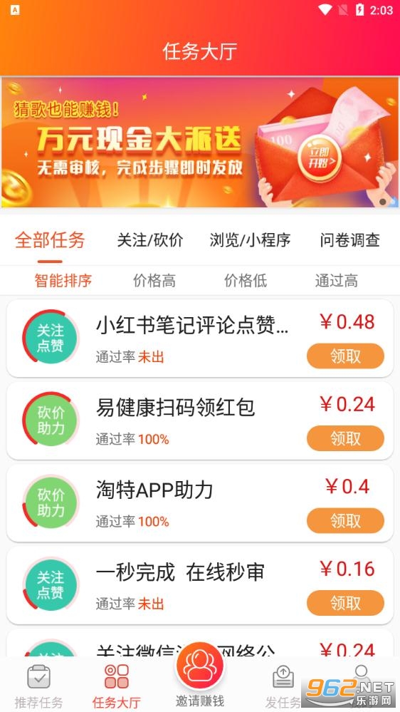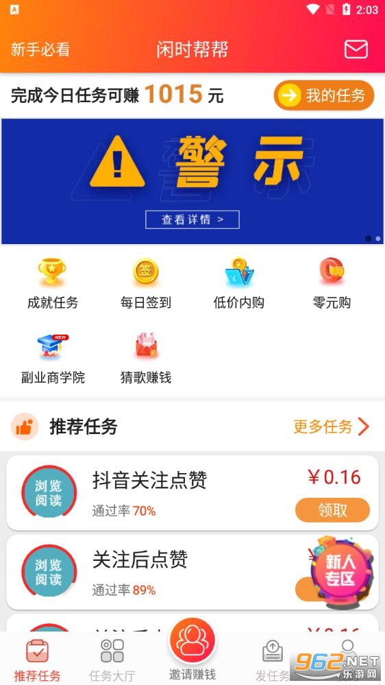 一款全新上线的手机网赚平台,你可以根据自己的喜好来选择不同的赚钱任务,上手简单,赚钱轻松,提现也非常方便,感兴趣快来962试试吧!