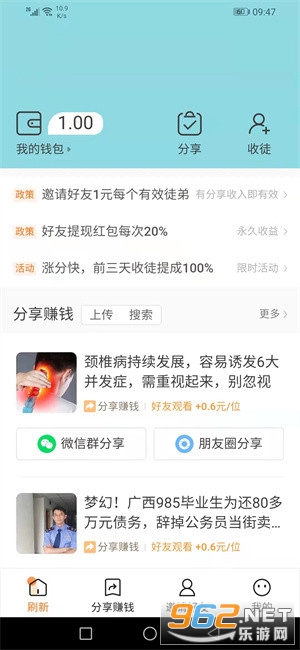 2、登陆成功就会有1元新人红包,转发文章单价0.6元/阅读,邀请收徒前三天两级提成翻倍至100%,之后无提成