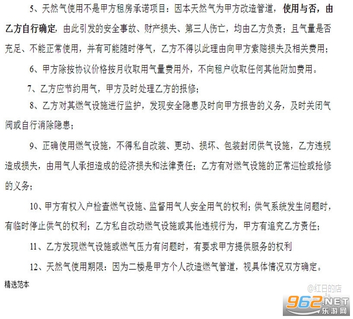 4、天然气使用不是甲方租房承诺项目:因本天然气为甲方改造管道,使用与否,由乙方自行确定,由此引发的安全事故、财产损失、第三人伤亡,均由乙方负责;且气量是否充足、不能正常使用,并有可能随时停气,乙方不得以此理由向甲方索赔损失及相关费用;